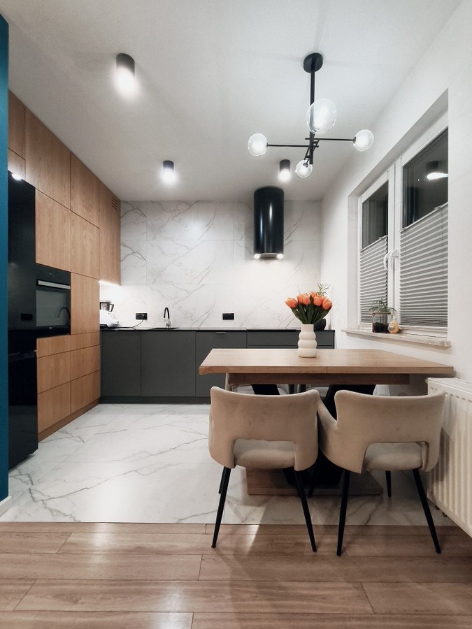 Całość została zaprojektowana tak, aby zapewnić wygodę codziennego życia i naturalne połączenie części wypoczynkowej, jadalnianej oraz kuchennej.