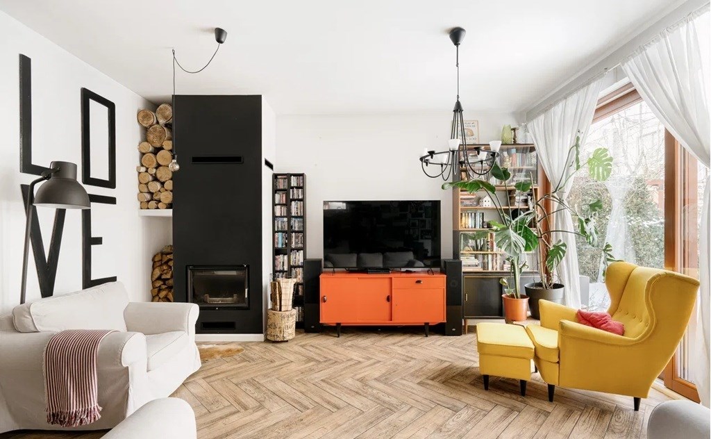 Serce domu stanowi przestronny, jasny salon z kominkiem, który tworzy wyjątkowy klimat – idealny na rodzinne wieczory. Otwarta kuchnia z częścią jadalnianą sprzyja wspólnemu spędzaniu czasu.