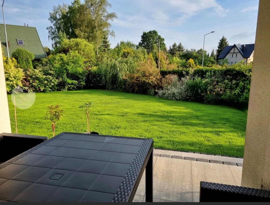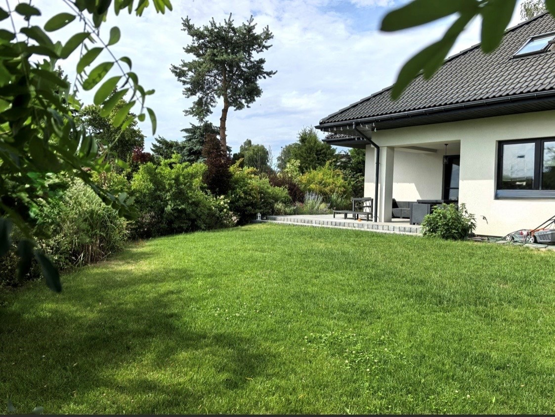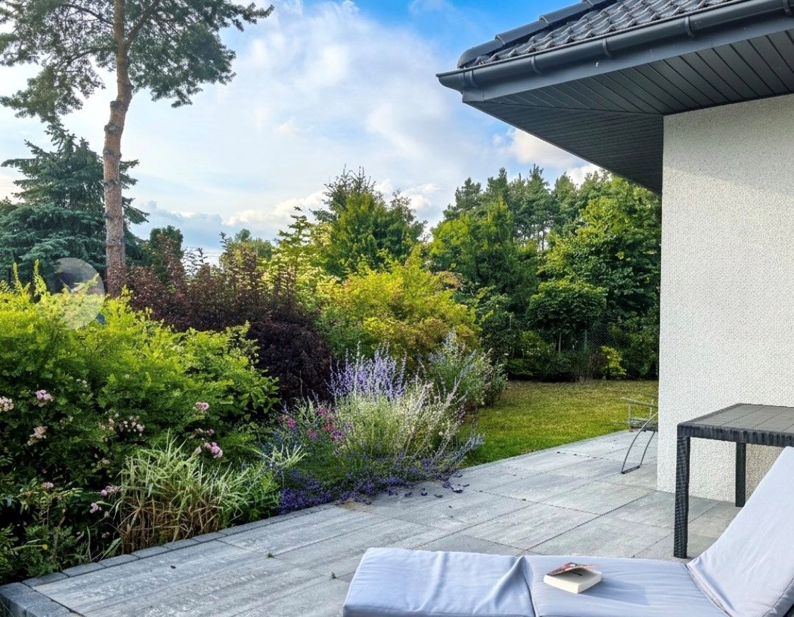 Dom usytuowany jest na dużej działce o powierzchni 1614 m². Pięknie zagospodarowany ogród z licznymi nasadzeniami oraz tarasem zapewnia idealne warunki do wypoczynku. Dodatkowym atutem jest wydzielona, bardziej naturalna – „leśna” część działki, dająca ogromne możliwości aranżacyjne.