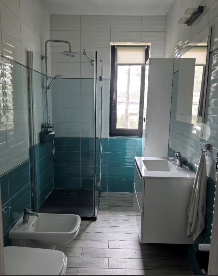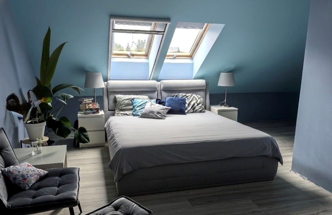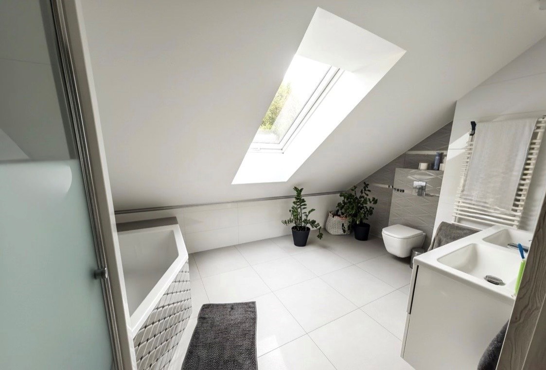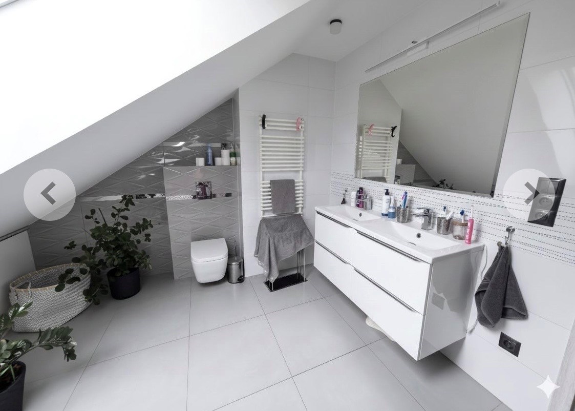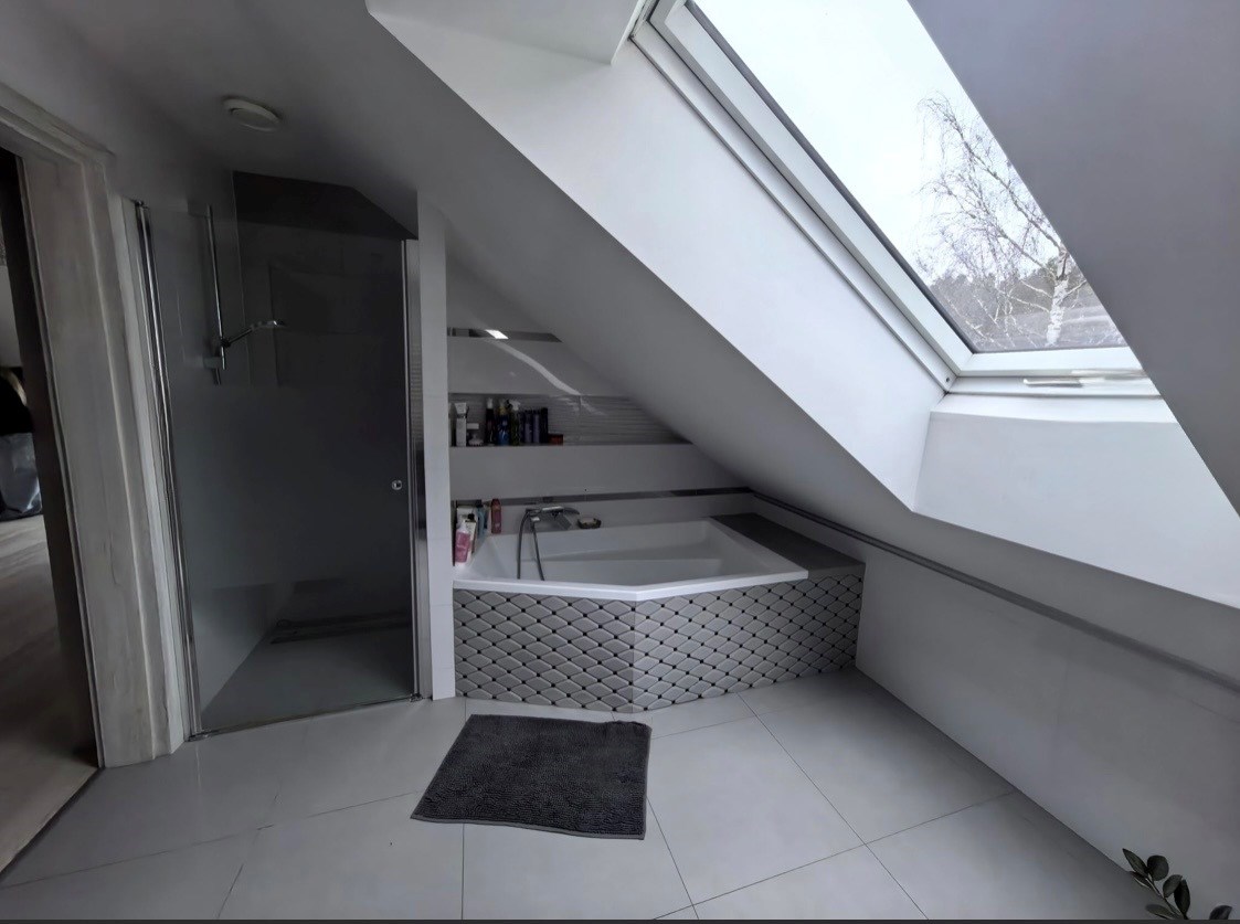 Piętro stanowi prywatną strefę domowników – trzy duże sypialnie, każda z własną garderobą oraz przestronna łazienka wyposażona w wannę, prysznic i podwójną umywalkę.