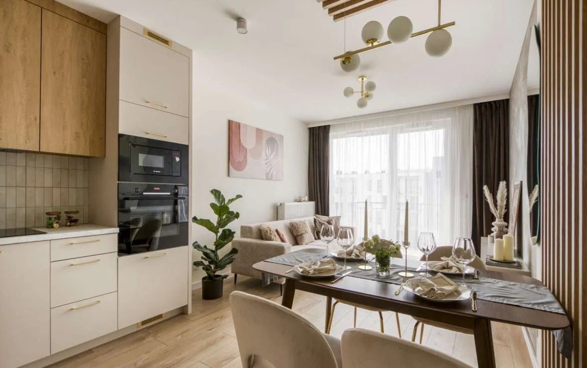 - Pełne wyposażenie AGD: lodówka, płyta indukcyjna, piekarnik, zmywarka, mikrofalówka i okap – wszystko, czego potrzebujesz!